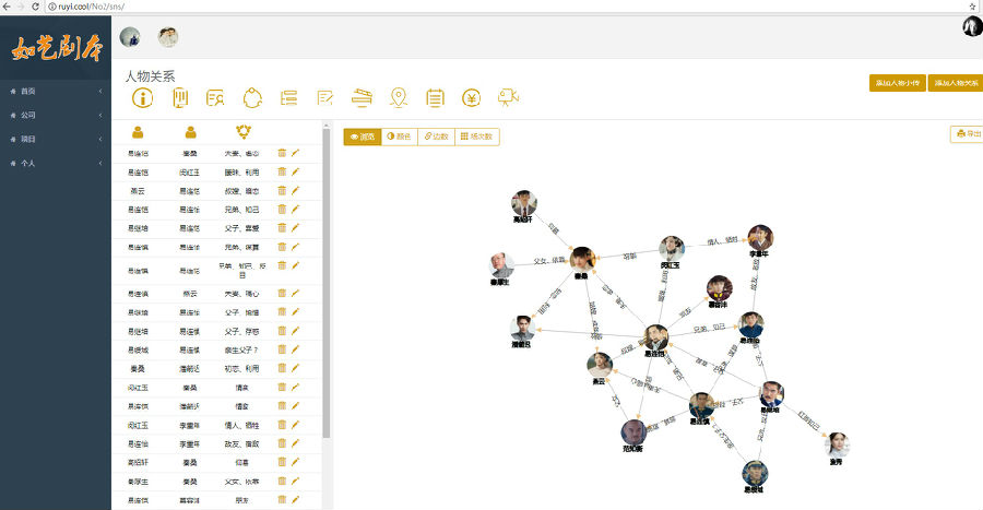 计算机公司文化大数据实验室与艺术学部影视专家合作,基于Neo4J技术研究了中国演员社交网络和剧情人物关系网络,应用于如艺剧本(www.ruyi.cool)系统,以大数据技术辅助剧本创作,基于群智创作和知识关联提高剧本创作质量,系统包含故事梗概、人物小传、人物关系、分集大纲、剧本写作、事件关系、拍摄场景、人物场次、拍摄通告管理等模块,以剧本为核心提供编剧、导演、制片人、演员和统筹的协作平台,是一个以剧本为核心的云端影视项目管理系统,目前处于线上测试,研发团队携如艺剧本参加了Neo4J中国聚会并做了分享。