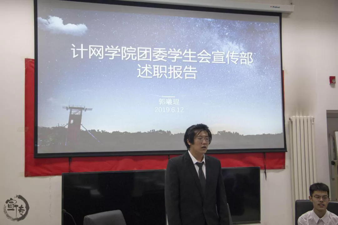 宣传部部长竞选人郭曦琨在大会上陈述一年以来的工作经验总结,并详细讲解新的一年自己的工作设想、各项规则和人员安排计划。