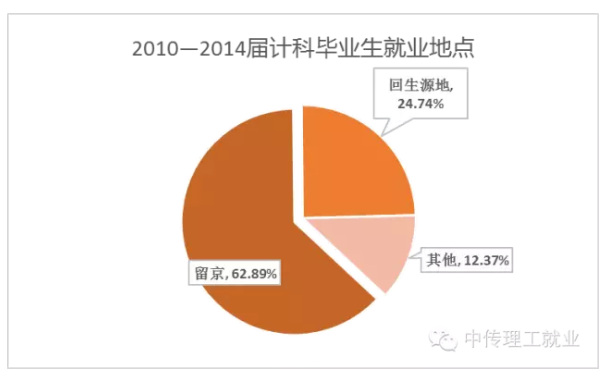 很明显,计科毕业生中选择留京就业的比重很大,这当然与北京地区信息科技产业发展迅速,规模庞大有极大的关系,图中的其他是指毕业生前往非生源地的其他地区,多为杭州,深圳,广州等发达城市。