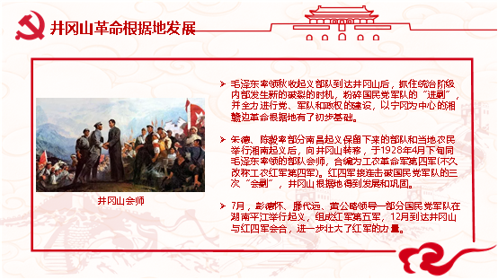 19级硕士王心如首先给我们介绍了从南昌起义到井冈山革命根据地的创建。1927年大革命失败后,国内政治局势急剧逆转,中国革命陷入低潮。蒋介石政权建立起在全国范围内的统治,共产党员和革命群众遭到无情杀害,达31万人,工农运动走向低沉。在这种情况下,在严峻的生死考验面前,革命前途仿佛已变得十分黯淡,中国共产党和中国人民并没有被吓倒,被征服。他们从地下爬起来,揩干净身上的血迹,又继续战斗。1927年7月中旬,中共中央临时政治局常委会断然决定了三件大事:将党所掌握和影响的部队向南昌集中,准备起义;组织湘鄂赣粤四省的农民,在秋收季节举行暴动;召集中央会议讨论和决定新时期的政策和方针。毛泽东、朱德等领导的井冈山根据地的斗争,代表着中国革命发展的正确方向。在革命处于低潮的时候,井冈山根据地的创建,以及在武装斗争、土地革命和根据地建设等方面的成功实践,不仅为各地起义部队实行“工农武装割据”树立了榜样,并且在革命者的心中燃起新的希望。