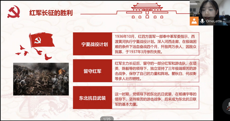2019级硕士党支部的赵雪向大家分享了遵义会议的伟大转折和红军长征的胜利。由于党内发生了“左”倾错误以及第五次反“围剿”的失败,中央红军被迫进行长征。在长征过程中召开的遵义会议确立了毛泽东在党和红军中的领导地位,在极其危急的情况下挽救了党,挽救了红军,挽救了中国革命,是党的历史上一个生死攸关的转折点。在遵义会议后毛泽东带领红军在1936年10月取得了长征的胜利,使中国革命转危为安。