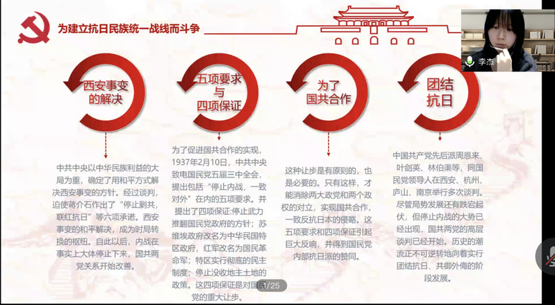 今天的最后一部分分享内容是由李杰给大家带来的为建立抗日民族统一战线而奋斗。主要讲述了长征胜利后中国共产党为抵抗日本侵略者而做的一系列努力,瓦窑堡会议、西安事变、国共合作等都包含其中。
