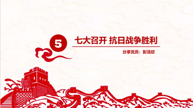 最后,18数科彭浣欣介绍了党的七大和抗战的最终胜利。七大制定了党在新形势下的路线,即“放手发动群众,壮大人民力量,在我党的领导下,打败日本侵略者,解放全国人民,建立一个新民主主义的中国”。七大总结历史经验,把党在长期奋斗中形成的优良传统作风概括为三大作风,即理论和实践相结合的作风,和人民群众紧密联系在一起的作风,自我批评的作风。确立毛泽东思想在全党的指导地位,是七大的历史性贡献。1945年上半年,世界反法西斯战争进入最后胜利阶段。在极为有利的国际形势下,中国抗日战争进入全面反攻阶段。815日,日本天皇宣布无条件投降。中华民族对世界反法西斯战争作出的重大贡献,使中国的国际地位空前提高。这是中华民族由衰败走向振兴的重大转折点。
