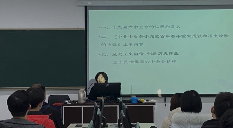 这次宣讲会由毛教授为我们作解读,她对其中的重点内容作了简单易懂的分析,让我们知道这次全会的重要意义。毛教授指出全会最重要的成果是通过了《中共中央关于党的百年奋斗重大成就和历史经验的决议》,这个决议是历史上的第三个决议,是总结和审视党的历史经验重要文件,是纲领性文件,是政治宣言,是行动指南。这次会议让我们真正地认识到什么是正确的党史观,在新时代来临之下,作为共产党员,我们该以什么标准去要求自己。从探索过去我们为什么能够成功到了解未来我们怎样才能继续成功,使我们深刻认识到红色政权的来之不易、新中国来之不易、中国特色社会主义来之不易,增强我们继续前进的勇气和力量。