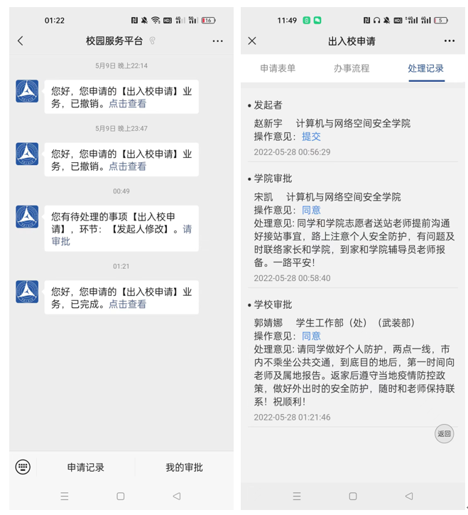 2018级数科专业的赵新宇同学回到家乡后,特意发来信息表达自己的感激之情,她说:“这几天让我很感动,回家程序在公司各位老师帮助下很快完成,也给我安排了老师接送,而且我发车时间很早,所以还要老师起很早送我,非常感谢老师。早上出校非常顺利,顺利回家,顺利毕业,真的很感谢各位老师!”