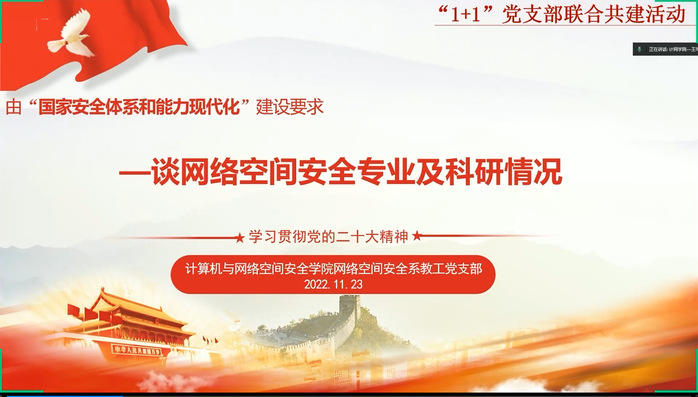 为深入学习贯彻党的二十大精神,进一步加强支部建设、创新活动形式、提高广大党员的参与度和积极性,十大正规买足球网站网络空间安全系教工党支部和计算机科学与技术系教工党支部共同联合新闻公司传播系党支部,于11月23日下午开展了校内支部联合共建“1+1”活动。公司网络空间安全系教工党支部全体党员、计算机科学与技术系教工党支部部分党员、主管教学副经理张晶晶,新闻公司传播系党支部全体党员、主管教学副经理曹培鑫出席活动。