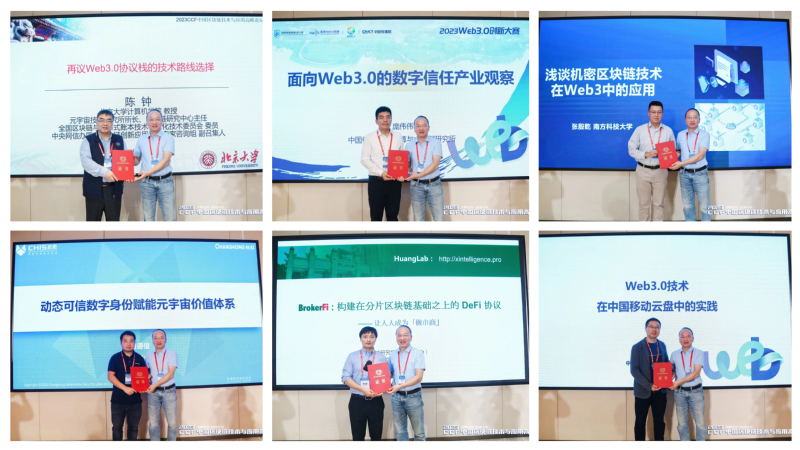 北京大学教授、元宇宙技术研究所所长陈钟,中国信息通信研究院云计算与大数据研究所副主任庞伟伟,南方科技大学教授、斯发基斯可信自主系统研究院信息安全研究中心主任张殷乾,四川长虹电子控股集团有限公司信息安全实验室资深专家、高级软件工程师黄德俊,中山大学百人计划副教授黄华威,大有云钞科技有限公司总裁&CEO李立中,中移互联网有限公司云产品事业部研发总监张云分别以《再议Web3.0协议栈的技术路线选择》《面向Web3.0的数字信任技术与产业观察》《浅谈机密区块链技术在Web3中的应用》《动态可信数字身份赋能元宇宙价值体系》《BrokerFi:构建在分片区块链基础之上的DeFi协议》《共产经济权识生态元宇宙架构》《Web3.0技术在中国移动云盘中的实践》为题作主题报告,分论坛主席范永开副教授分别为报告嘉宾颁发CCF讲者证书。