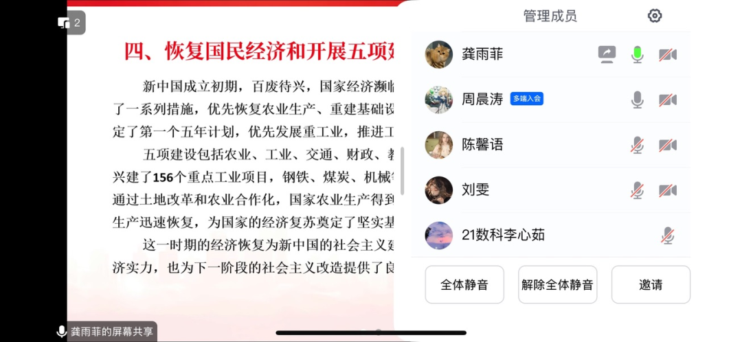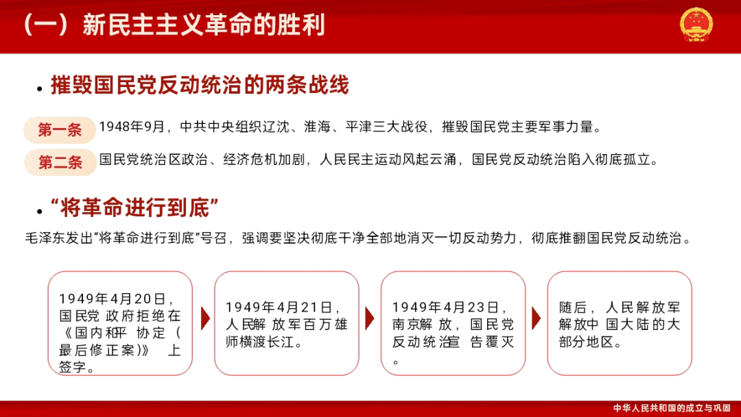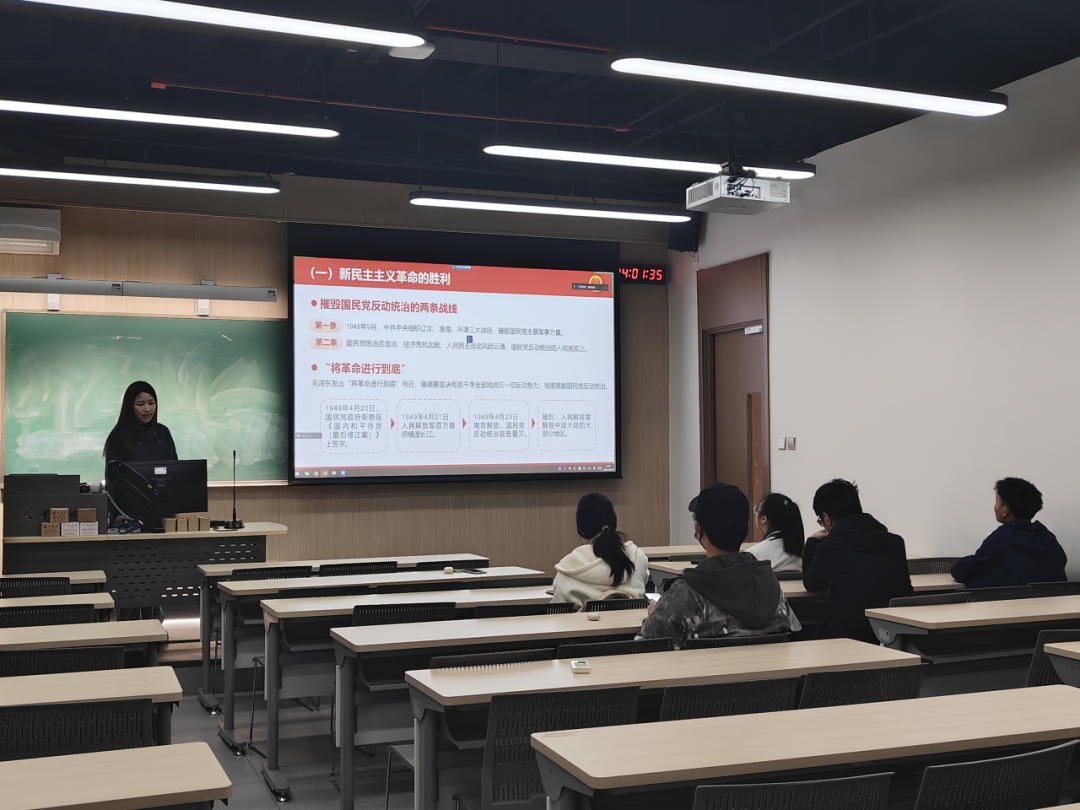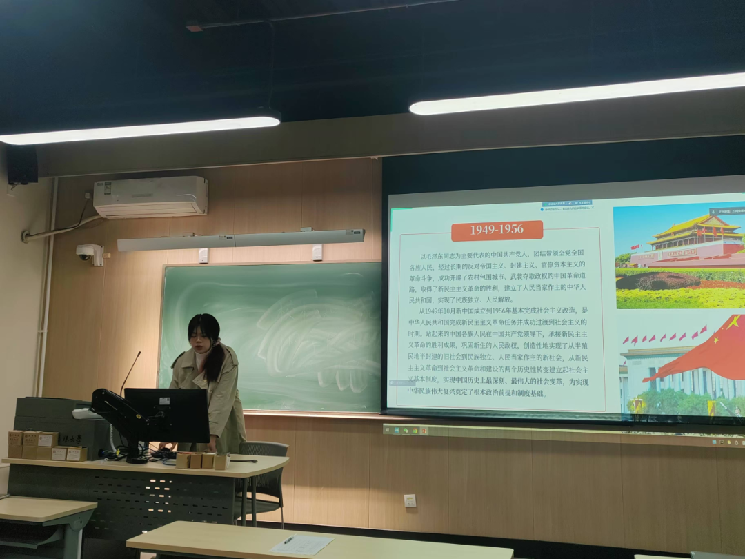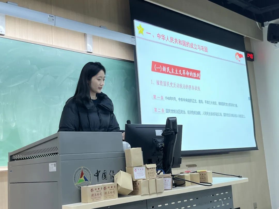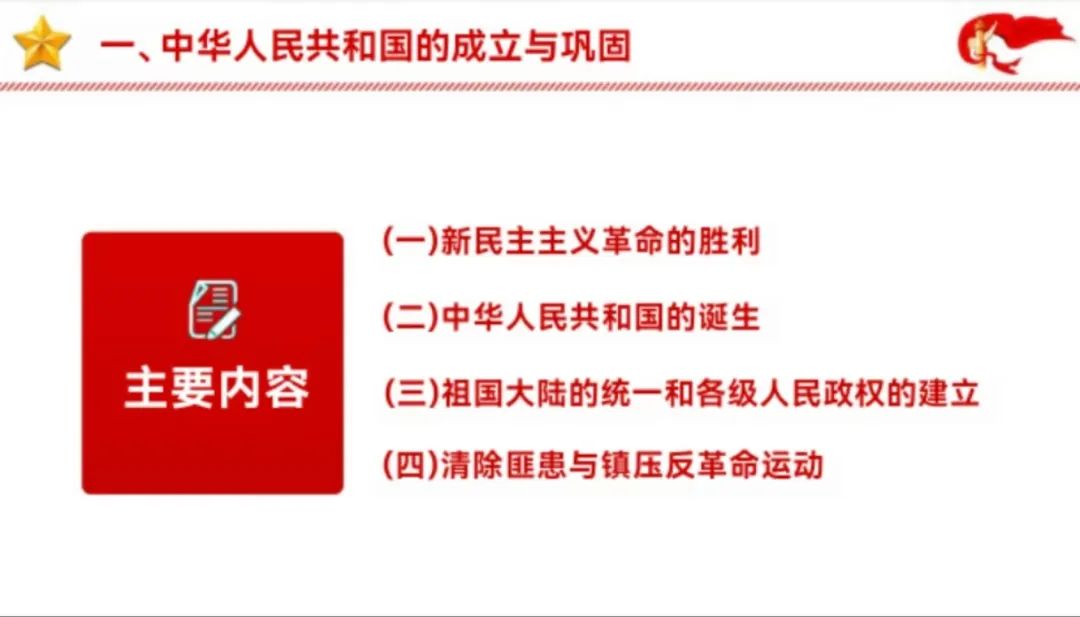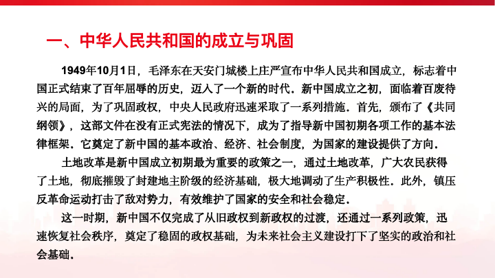 狄雨萌同志和大家一起回顾了新中国成立和社会主义基本制度的确立,具体内容包括以下几个部分:中华人民共和国的成立,彻底结束了旧中国半殖民地半封建社会的历史,实现了中国高度统一和各民族空前团结;废除封建土地制度消灭了地主阶级封建剥削的土地所有制,是近代以来中国人民反封建斗争的一个历史性胜利;独立自主外交和抗美援朝,展现了东方睡狮觉醒的力量,所赢得的国际威望和战略地位都将是中华民族伟大复兴的宝贵财富。习总书记说:“江山就是人民,人民就是江山。”人民是历史的创造者,是真正的英雄。回顾中华人民共和国历史,集中呈现了新中国为世界谋大同的责任担当,为推动构建人类命运共同体、维护人类共同利益和共同价值作出的重要贡献。