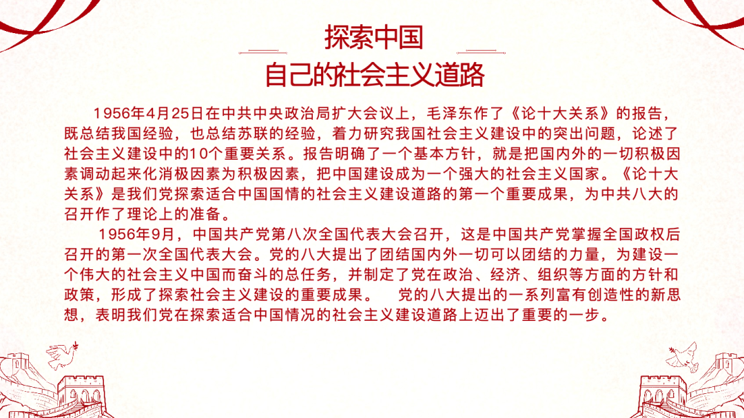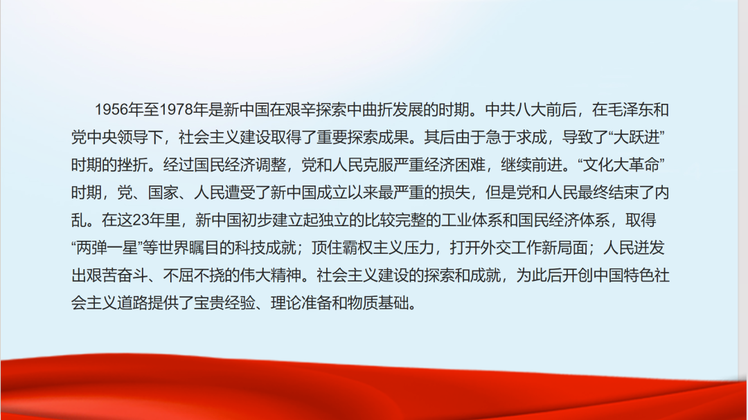 魏晓宇同志回顾了探索中国自己的建设社会主义的道路的历程。在党的领导下,我们探索了适合中国国情的社会主义建设道路,这段历程充满了艰辛与曲折。通过党的八大,我们明确了建设社会主义的总体任务,确立了把我国从落后的农业国变成先进工业国的目标。随后在《论十大关系》报告中,毛泽东同志提出了调动一切积极因素的基本方针,为党的八大作出理论准备。尽管在“大跃进”和人民公社化运动中遇到了严重挫折,但党和人民迎难而上,在经济调整中不断摸索经验,逐步恢复国民经济,为此后中国特色社会主义道路奠定了坚实基础。
