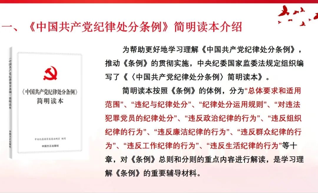 宋奕萱同志首先介绍了《中国共产党纪律处分条例》简明读本。接着,从四个方面深刻讲解了《中国共产党纪律处分条例》的重要意义,并对《条例》的主要内容进行深入解读。随后,从“提升政治素养,筑牢思想根基”“加强纪律教育,推动作风建设”“增强拒腐防变能力,保持清正廉洁”“以优良纪律作风保障高质量发展”四个角度进一步阐释了如何理解和落实《条例》精神。最后宋奕萱同志强调,各位党员和积极分子要把学习贯彻《条例》作为常态化、长效化的工作,不断锤炼党性,增强纪律自觉,坚持思想上不放松、行动上不懈怠,为党的事业和社会发展奠定坚实的基础。