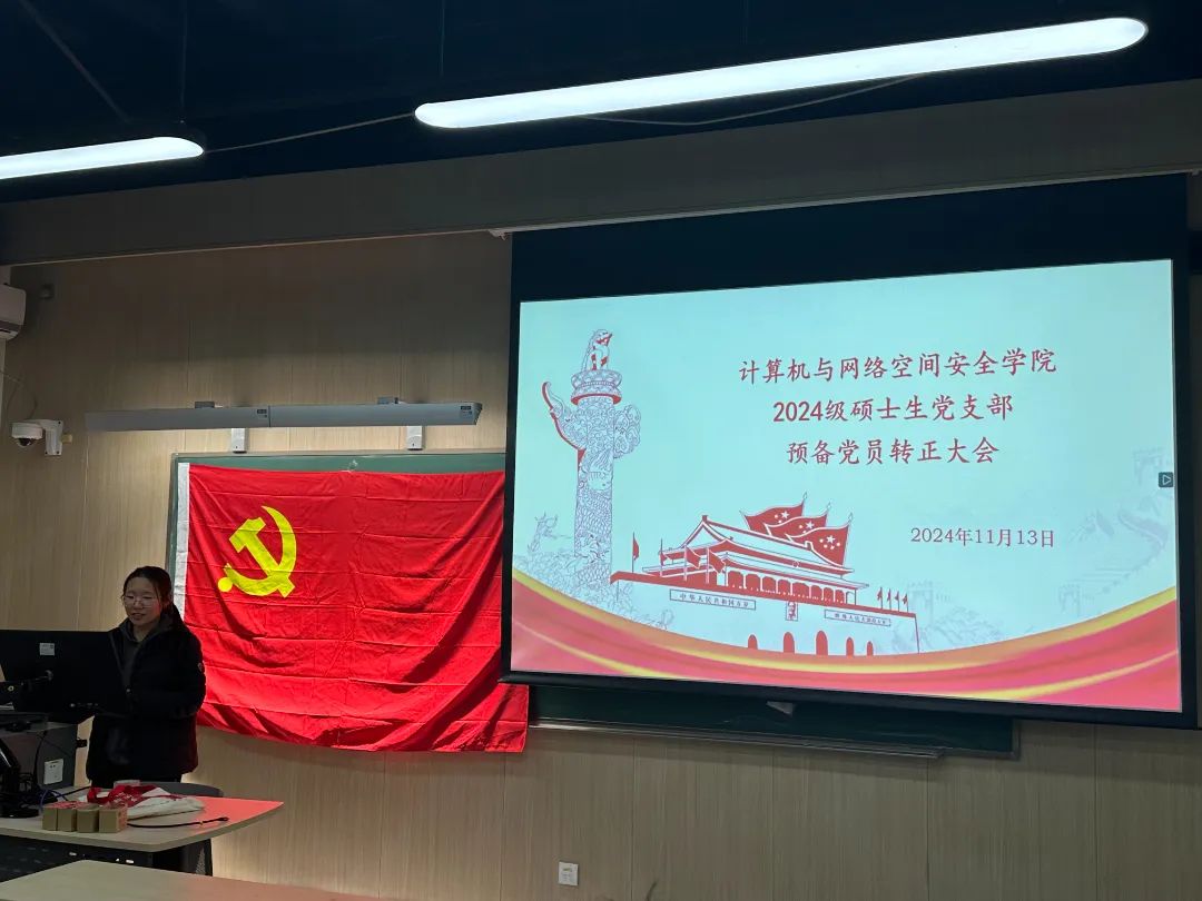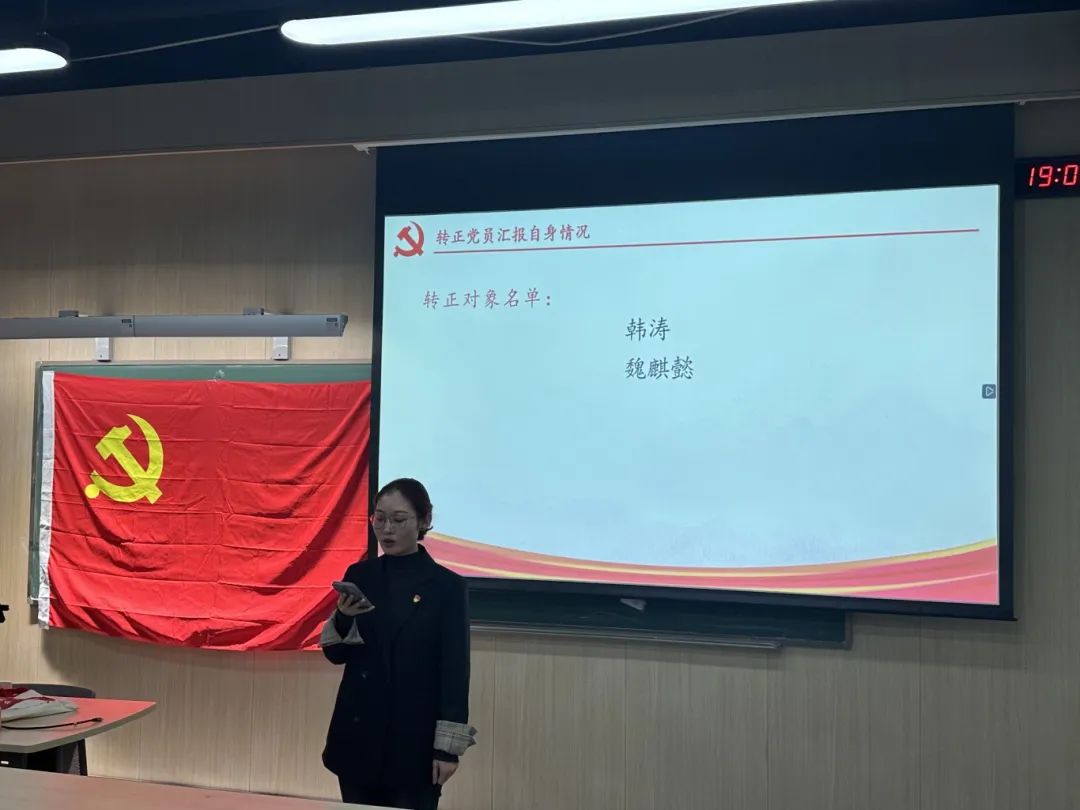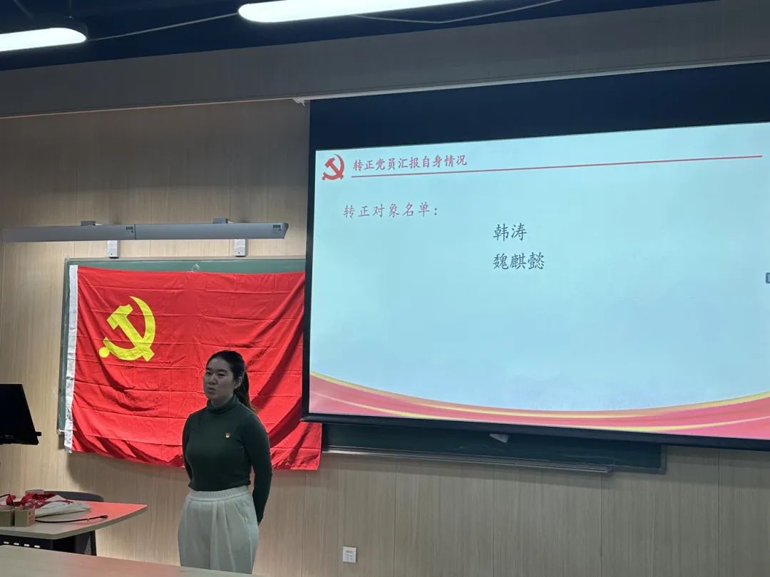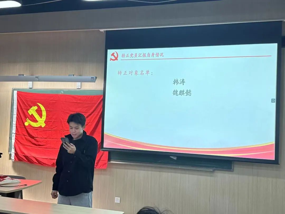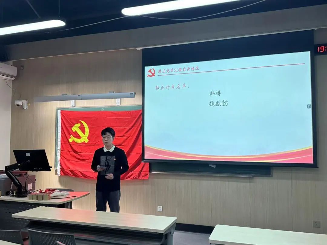 2024年11月13日下午7时,为贯彻落实党员发展工作指导思想,做好发展党员工作,十大正规买足球网站2024级硕士生党支部召开了预备党员转正大会,由党支部书记主持,会议内容为讨论韩涛、魏麒懿2名预备党员同志按期转为正式党员的表决决议。