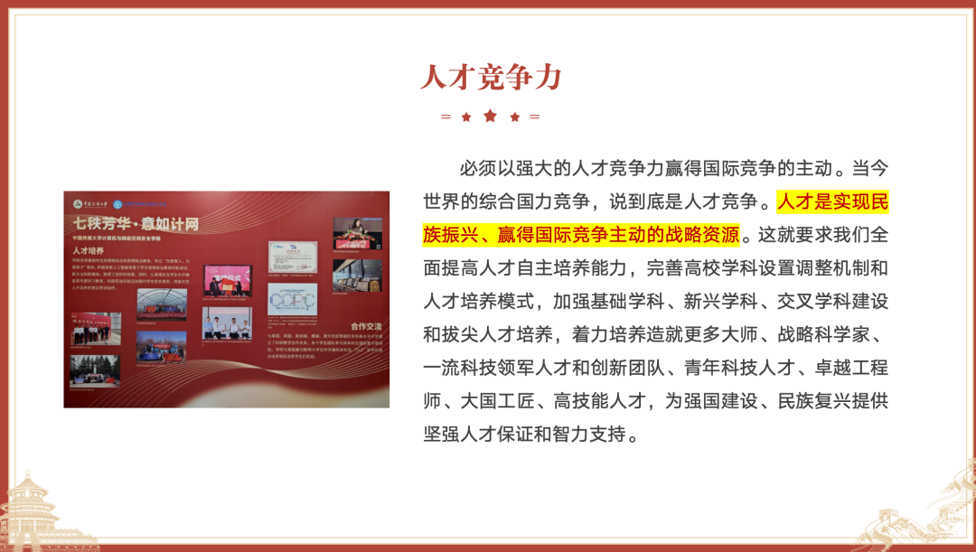 须以强大的人才竞争力赢得国际竞争的主动。人才是实现民族振兴、赢得国际竞争主动的战略资源。这就要求我们全面提高人才自主培养能力,完善高校学科设置调整机制和人才培养模式,加强基础学科、新兴学科、交叉团队建设和拔尖人才培养。