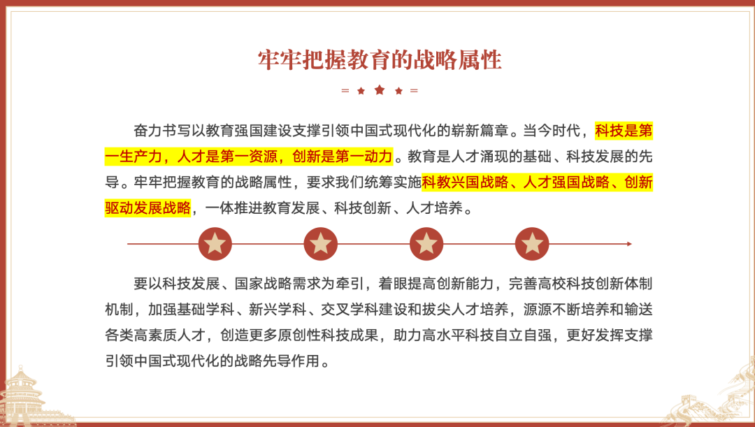 牢牢把握教育的政治属性。坚定不移培养德智体美劳全面发展的社会主义建设者和接班人。培养什么人、怎样培养人、为谁培养人是教育的根本问题,也是建设教育强国的核心课题。