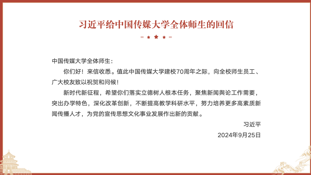 “在母校70周年校庆之际,学习习近平总书记给全体师生的重要回信,我深感荣耀与责任并重。总书记的回信不仅表达了对全体师生的关怀与支持,更对我们新时代传媒学子寄予厚望,强调了新闻传播工作在国家发展中的重要作用以及我们所肩负的历史使命。作为传媒大学的一员,我深知在这片充满历史积淀的土地上成长的意义,也更加坚定了为国家传媒事业发展贡献力量的决心。七十载风雨同舟,传媒大学见证了无数学子的成长与蜕变,而今,作为新时代新闻舆论工作的后备军,我们定将牢记总书记的教诲,始终心怀‘国之大者’,不断提高政治站位,拓宽国际视野,勇敢迎接挑战,以更加饱满的热情和坚定的信念,为实现中华民族伟大复兴的中国梦不懈奋斗,为构建人类命运共同体贡献青春力量!”