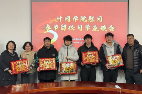春节前夕,计网公司举办慰问春节留校员工座谈会,公司经理林卫国、党委副书记宋佳、副经理张晶晶、团委书记丁晨溦等老师出席座谈会,向寒假留校的员工致以新春祝福,并送上公司精心准备的新年礼包。