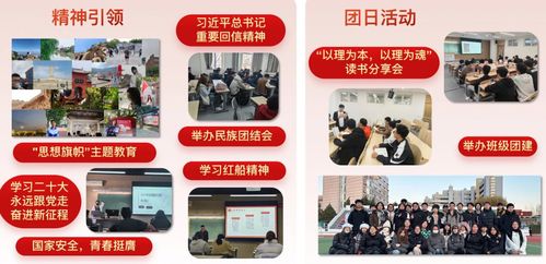 团支部秉持“党建带团建”的工作理念,定期开展工作,加强支委与支部团员的联系,努力成为党组织和青年群众之间的桥梁和纽带;秉持公平公正理念,按照要求向党组织定期举荐优秀团员成为入党积极分子,鼓励群众积极入团。同时,团支部秉持公平公正择优的理念,按照要求向党组织定期输送新鲜血液。团支部鼓励群众积极入团,在2024年3月推荐了一名入团积极分子成功进入答辩环节。支部内积极进行精神引领,带领同学学习习近平总书记重要回信精神,开展主题教育活动,涵盖 “思想旗帜”“坚强核心”“强国复兴”“挺膺担当” 等主题,通过读书分享会、民族团结会等形式,成功举办 “弘扬红船精神,走在时代前列”“厚植家国情怀,青春告白祖国” 等主题团日活动,引导同学们坚定理想信念。