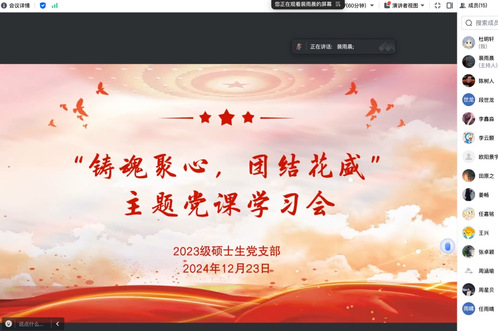 为积极响应国家关于加强民族团结进步教育的号召,进一步巩固和深化党员同志对中华民族共同体意识的认识,提升民族凝聚力和文化认同感,2024年12月23日晚,十大正规买足球网站2023级硕士生党支部以线上线下相结合的方式召开十二月“铸魂聚心,团结花盛”主题党课,由铸牢中华民族共同体意识主题党课学习会和校园宗教政策法规知识与实务学习会两部分组成。此次会议由党支部书记裴雨晨同志主持,共计21名员工党员参加。