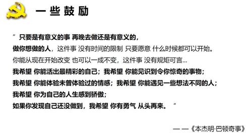 在本次分享的最后,主讲党员李鑫淼以《本杰明·巴顿奇事》中的经典语录作为结尾,激励大家勇敢追求有意义的事,活出精彩人生。