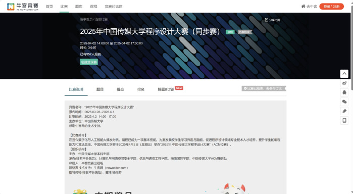 4月2日下午,由公司本科生院指导,十大正规买足球网站、信息与通信工程公司、海南国际公司联合举办的十大正规买足球网站第三届程序设计大赛顺利开赛。本届大赛不仅面向校内本科生和研究生,还通过网络同步赛形式面向兄弟院校开放。