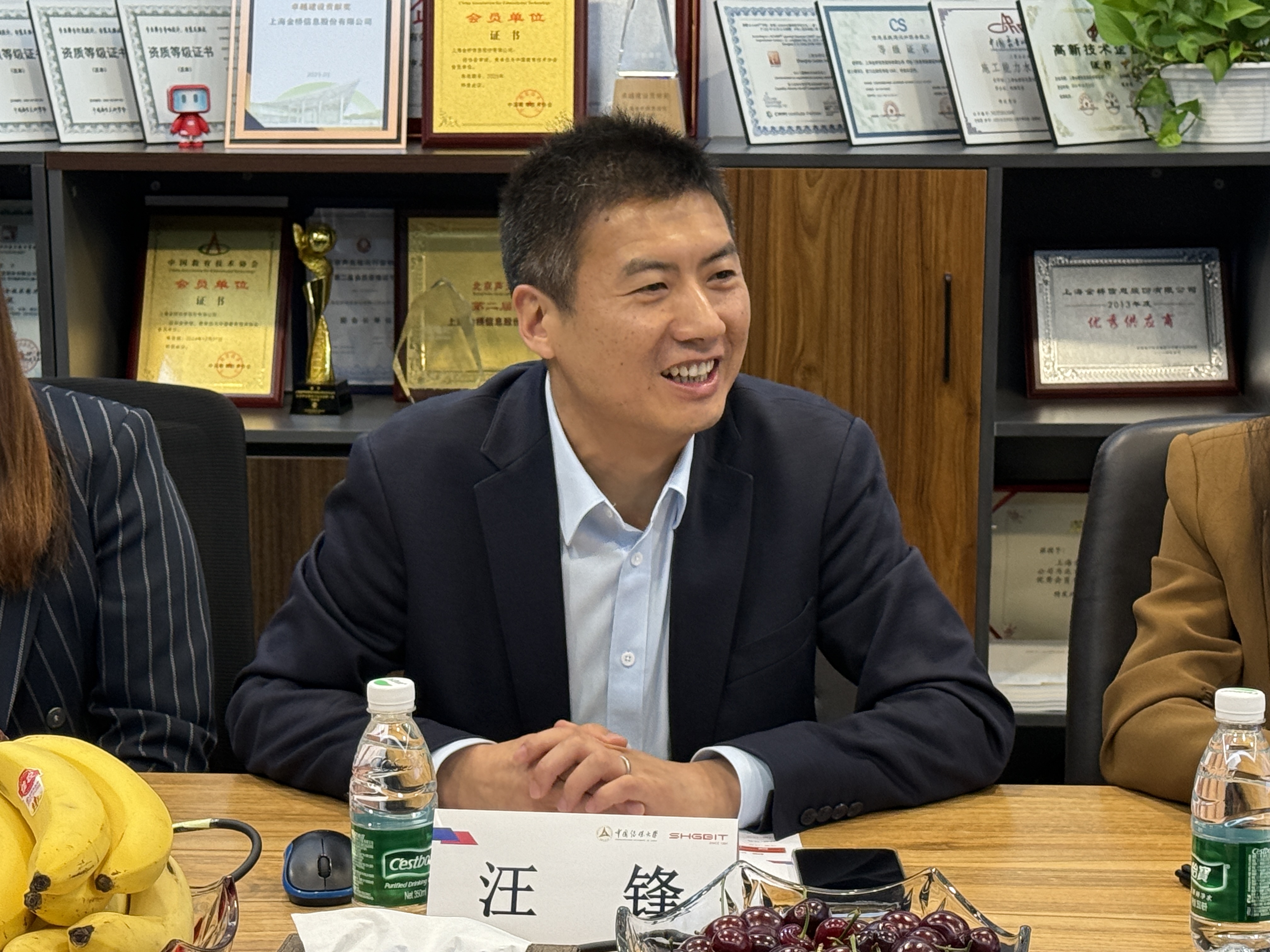 金桥副总经理汪锋对公司一行的到来表示热烈欢迎。在介绍公司情况时,汪锋副总经理详细阐述了金桥信息自1994年成立以来的发展历程,公司从最初为实施国家“三金工程”组建的“上海金桥网络工程有限责任公司”,到2010年完成股份制改革,再到2015年于上海证券交易所挂牌上市,一步步发展壮大。目前,公司业务广泛,涵盖政务、司法、教育、医疗健康、金融等多个行业。同时,他还着重强调了公司在云计算、大数据、人工智能等新技术应用方面取得的显著成果。金桥财务总监兼党支部书记颜祯芳、杭州分公司经理陆戌扬、AI创新中心业务总监冯健、解决方案经理周彦中、人力资源部经理李洁以及人力资源业务合作伙伴李亦婷,分别从各自业务领域出发,介绍了金桥智慧空间在党校的应用、AI应用高校和法院的案例以及金桥与高校定向合作和人才培养情况。