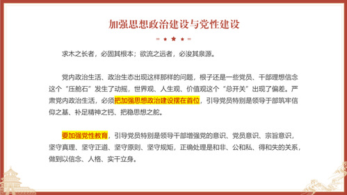 党内政治生活、政治生态出现这样那样的问题,根子还是一些党员、干部理想信念这个“压舱石”发生了动摇,世界观、人生观、价值观这个“总开关”出现了偏差。严肃党内政治生活,必须把加强思想政治建设摆在首位,引导党员特别是领导干部筑牢信仰之基、补足精神之钙、把稳思想之舵。