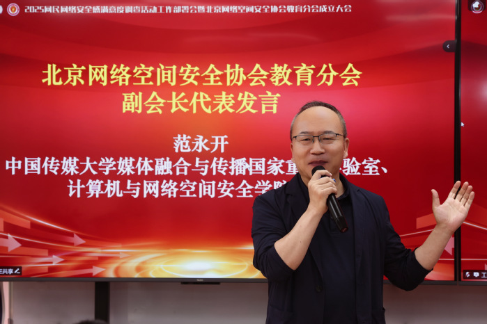 范永开教授作为副会长代表进行发言。他表示,未来将充分发挥公司在传媒与技术交叉领域的优势,推动人才培养与企业合作,开展数据安全、内容安全、传播安全、认知安全等方向的研究工作。同时,着力构建产学研企用一体化的社会责任体系,推动区块链安全、AI安全算法等前沿技术融入公司产品实践,助力破解网络安全人才实战能力不足的行业难题,为网络空间安全事业的高质量发展贡献智慧与力量。