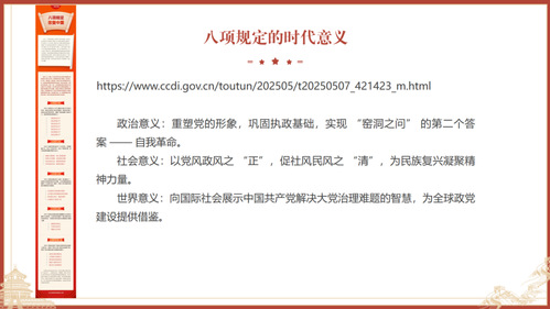 接着,主持人为大家讲述了八项规定从哪些方面改变中国,中央八项规定从制定和落实开局破题,解决了“新形势下作风建设抓什么、怎么抓”的根本性问题,以“小切口”打破长期存在的作风积弊。