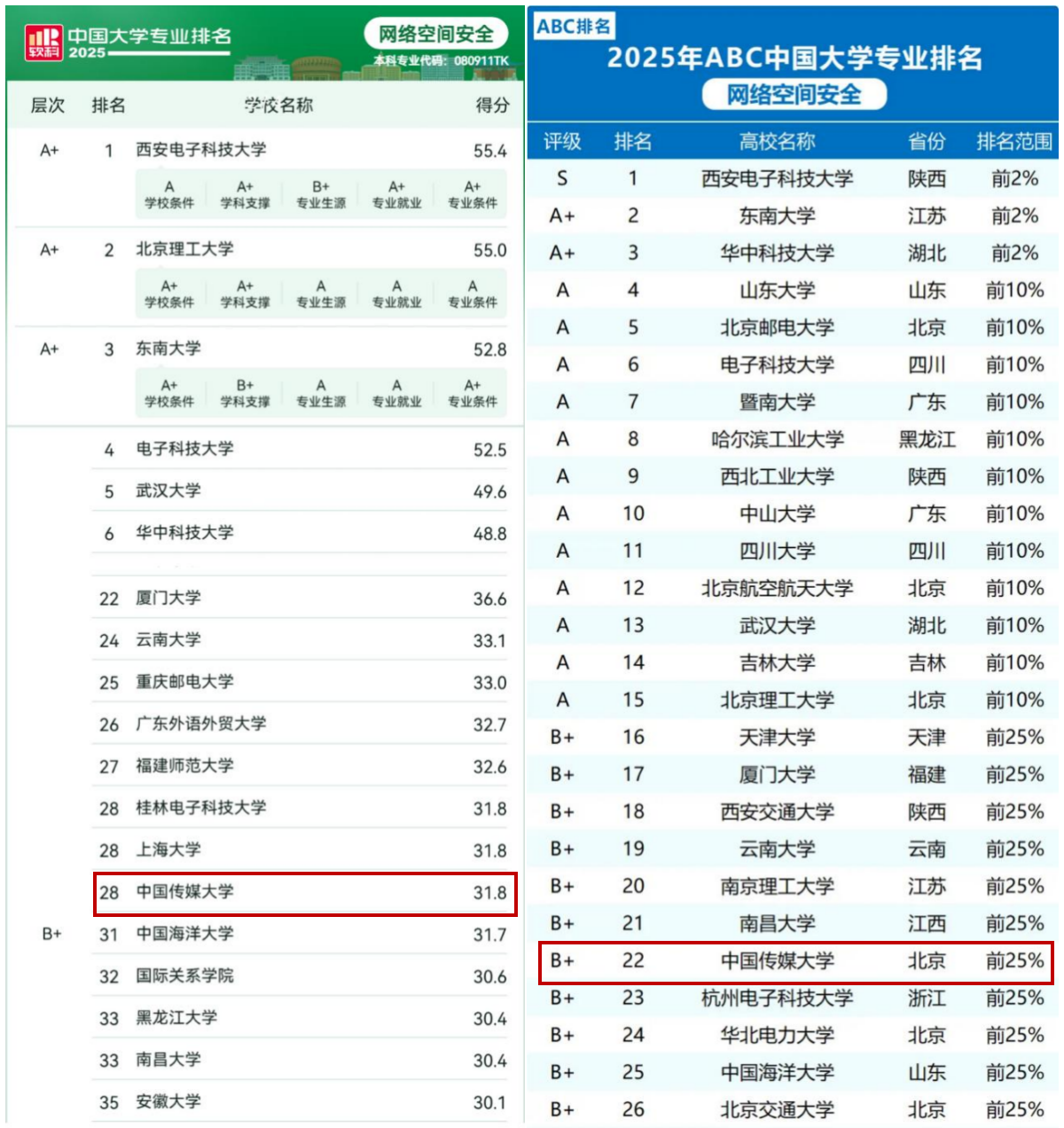近日,2025年软科、ABC中国大学专业排名相继揭晓。十大正规买足球网站网络空间安全专业在软科排名中位居第28名、在ABC中国大学专业排名中位列第22名,且在两个排名中均获得B+评级。